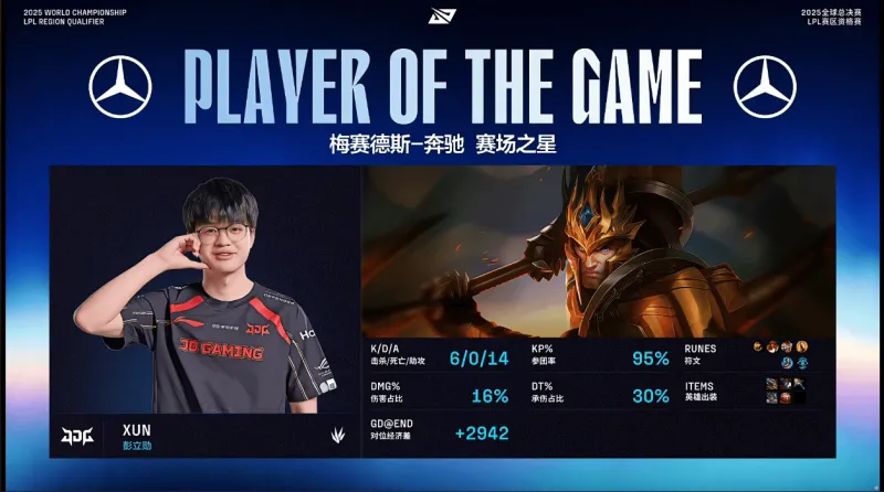 Xun使用皇子打出6/0/14战绩,斩获JDG对阵WBG第一局MVP