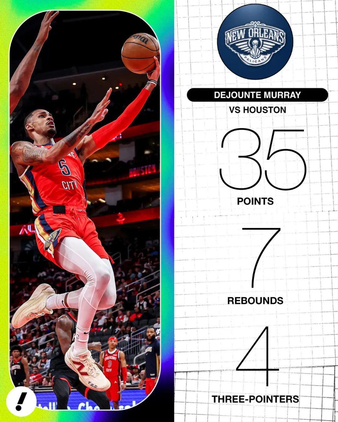 拿上一场对阵火箭的比赛来说,鹈鹕客场105-107不敌对手,但是德章泰穆雷的表现可以说相当不错: