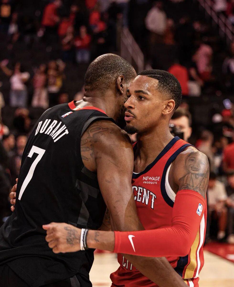 值得一提的是,在对阵火箭赛后,鹈鹕官方晒出了德章泰穆雷与杜兰特的合照,并且写道:“排除万难的两个人!”